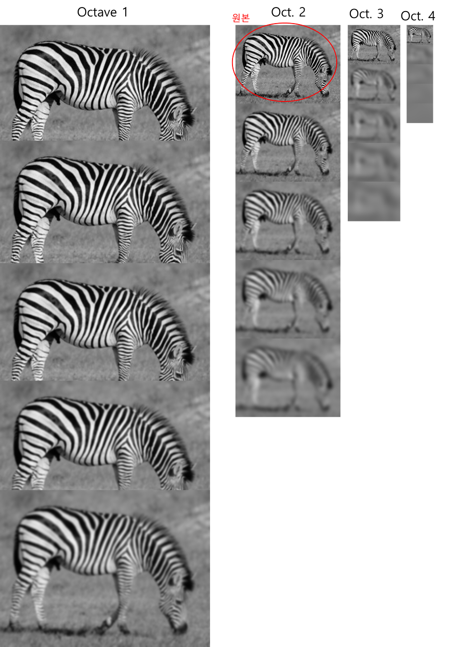 중간에 있는 DoG 이미지들 그냥 검은색 이미지 아닙니다. 컴퓨터 화면이 얼룩진건가 하시는 분들도 있을 텐데 자세히 봐보세요. 얼룩말의 형상이 보일 것입니다. 그래도 잘 안보이는 것 같아서, 정규화한 버전의 DoG 이미지들도 오른쪽에 추가했습니다. 이미지의 엣지 정보들이 잘 도출된 것을 확인할 수 있습니다. 이 과정이 모든 octave에서 동일하게 진행됩니다. 그러면 결과적으로 4개씩, 16장의 DoG이미지를 얻겠죠??