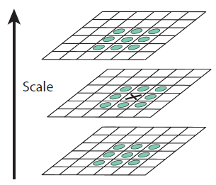 이제 DoG 이미지들에서 keypoint들을 찾을 차례입니다. 먼저 DoG 이미지들 내에서 극대값, 극소값들의 대략적인 위치를 찾습니다. 그림 7에 극대값, 극소값의 위치를 찾는 방법이 설명되어 있습니다.