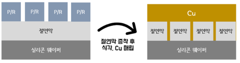 ->SiO2 증착 ▶ PR Coating ▶ Photo ▶ Develop ▶ SiO2 Etch ▶ PR Strip ▶ Cu 매립 ▶ CMP