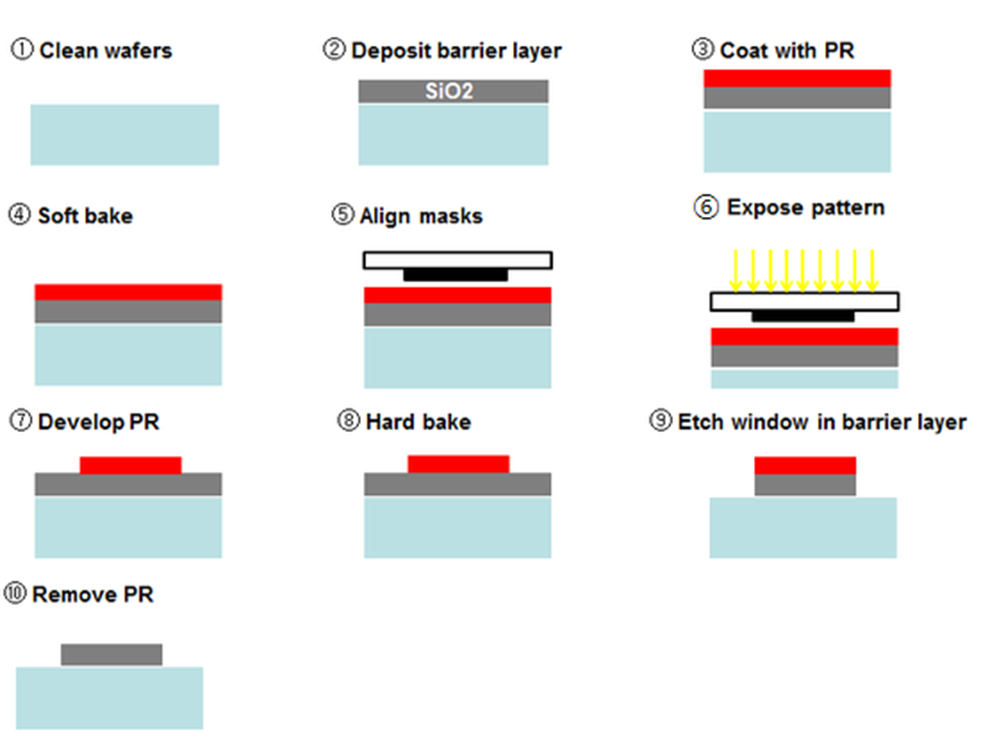 8) Hard Bake : rinsing과정에서 용액을 사용했기 때문에 높은 온도에서 남은 PR 용액과 액체들을 증발시키고 새겨진 패턴 부분을 감싼 PR 부분의 부착을 더욱 견고하게 한다.