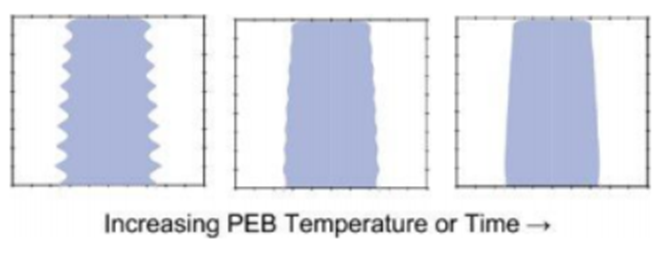 6) Post-Exposure Bake : 빛은 파장을 지니고 있어 수직으로 물결 모양의 패턴이 새겨지는데 열처리를 가하면 rough한 표면이 부드러워진다.