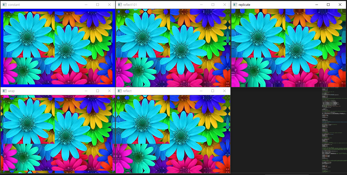 cv2.copyMakeBorder(영상, 상,하,좌.우 추가할 값, border타입(상수=픽셀값지정, reflect거울모드,등등))