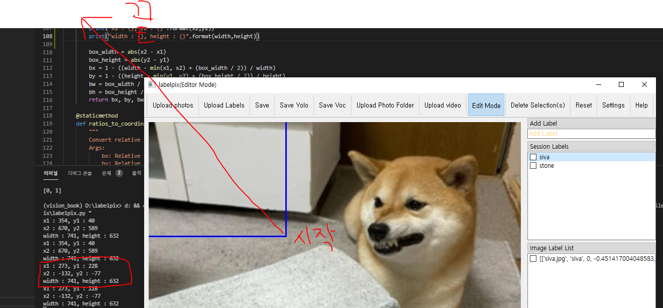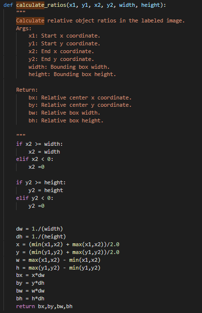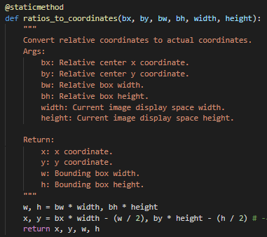 labelpix 코드 내부에 마우스로 드래그를 해서 bbox를 그리면 해당 bbox의 xmin, ymin, xmax, ymax, 그림 전체의 width, height를 받아서 yolo data전용 cx, cy, w, h로 변환시켜주는 메소드를 보았는데 변환해주는 수식 자체가 엉망인데다가