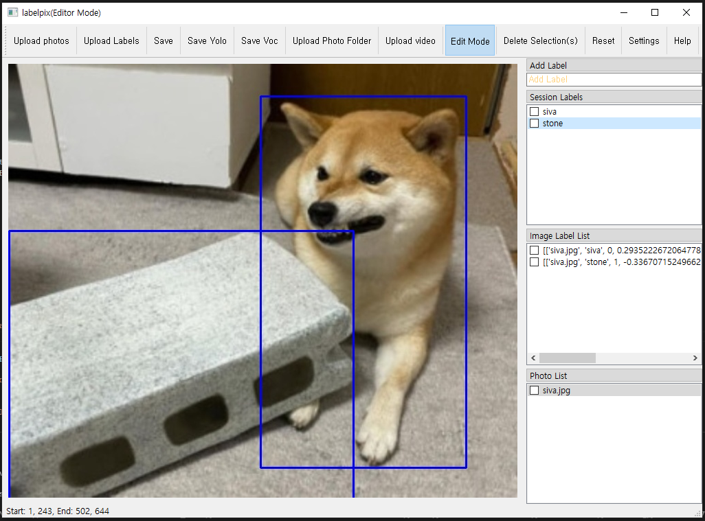 사진을 업로드해서 클래스를 입력한다음 바운딩박스를 마우스로 그려주면 해당하는 정보를 Pascal VOC(xml), YOLO(txt)버전으로 변환하여 이미지 라벨링을 해주는 유용한 툴이다.