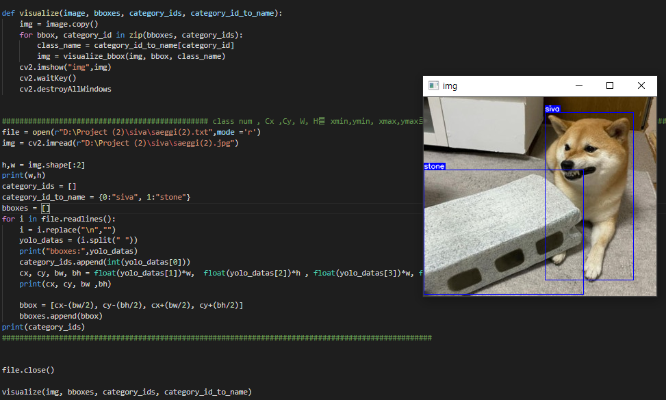 대충 눈대중으로 봐도 화면 밖에 그려져있는 bbox는 없는데 일단 xml, yolo 버전 라벨을 이용해 bbox를 시각화 해보겠다